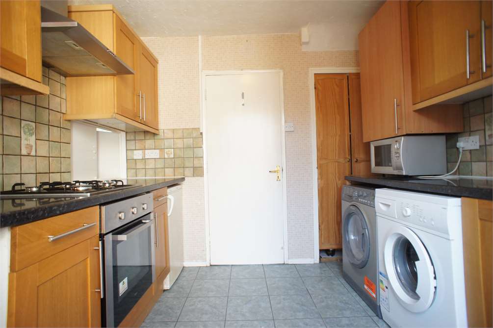 Fitted with tiled flooring, a range of wall and base units with worktops over, stainless steel sink unit with mixer tap and drainer over, tiled splashbacks, oven with gas hob and extractor fan over. Space for fridge/freezer and plumbing for washing machine and dishwasher. Double glazed window to rear aspect and PVCu doorway leading to: