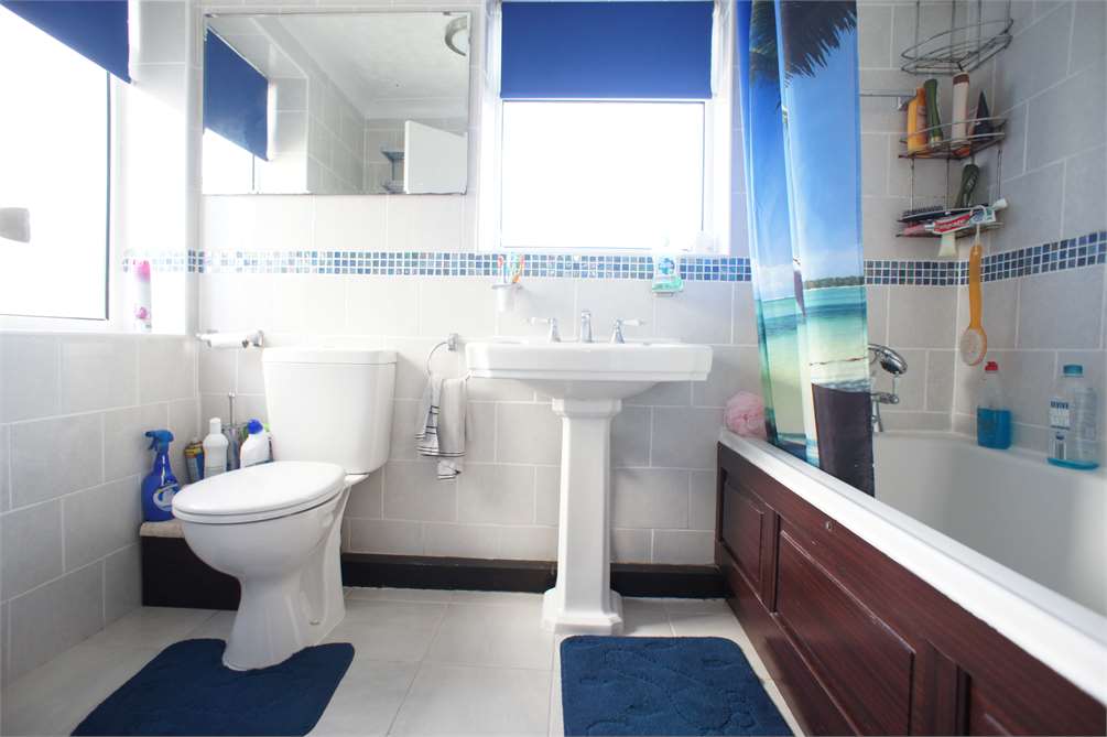 Fitted with tiled flooring, low level W.C., hand wash basin and bath with shower over. Part tiled walls, heated towel rail and double glazed, obscured glass window to rear aspect.