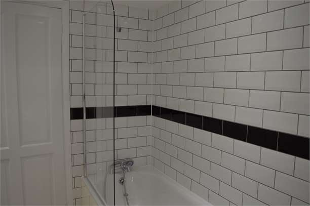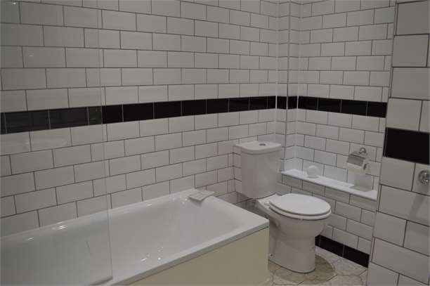 Bathroom: 7’36 x 8’65 New white bath suite, black and white tiles from floor to ceiling, there is a bath and separate walk in shower, ceramic tile flooring.